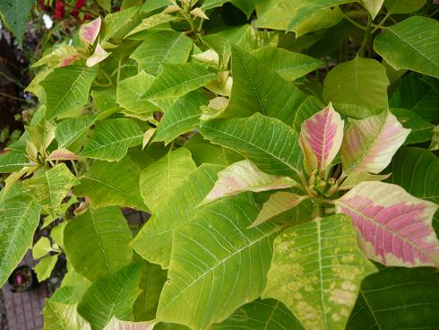 クリスマスに欠かせないお花といえばポインセチア(私の中の基準です)2年目・3年目のお花が準備中です。もう少ししたらきれいな色を見せてくれることでしょう。少し早いですが・・・2年目のポインセチア優しいクリーム色にピンクです3年目の赤、定番です。 霜にやられないように注意しなきゃ