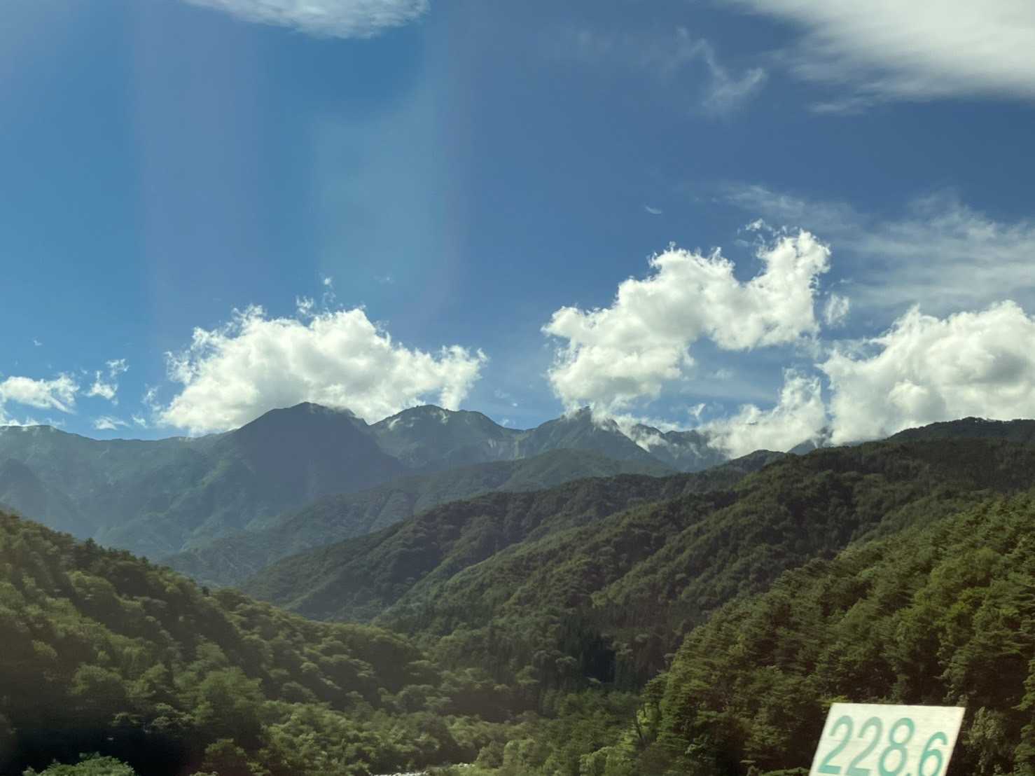 初日の8月19日は最高のお天気で、駒ケ根SAからは南アルプスの甲斐駒ヶ岳(中央少し左)や仙丈ヶ岳がとても綺麗に見えた。