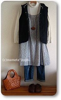 グローバルワークの小花柄キャミワンピ&キルティングベスト&デニム