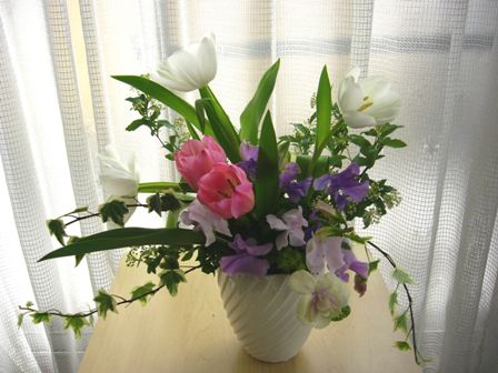 今日はティーズマリー・生花レッスンでした春のお花を使ってレッスンです☆花材☆・チューリップ(ピンク・ホワイト)・スイートピー(パープル)・葉ボタン・ブプレウルム・こでまり・アイビー☆ 応用コース KAさんの作品 ☆ステム(茎)の可愛いチューリップがメイン花材なので、ステムを生かしたデザインでアレンジして頂きました♪伸びやかで春らしいデザインに仕上がりました☆ 基本コース TYさんの作品 ☆ナチュラルステム・ブーケを作って頂きました♪スレンダーやマーメイドのドレスに似合うデザインです。初めてのブーケ製作でしたが、手際も良くとてもバランス良く仕上がりました「ブーケに葉牡丹?!」と思うかもしれませんが、ミニサイズの葉牡丹はとても清楚で可愛らしいんですよ