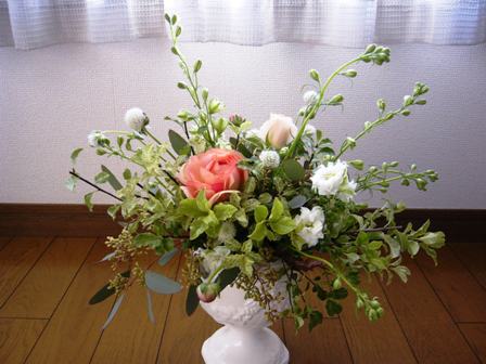 生花レッスンの余り花(ほとんどグリーンですが。。。)で、娘がアレンジを作りました適当にカットした花材とオアシスをセットした花器を渡して自由にアレンジさせてます。その間に私は片付けなどでバタバタ。。。本人も出来上がるまで見ないで!と言うので、遠めでチラっと眺めていると「わぁ!この葉っぱ可愛い!!ここに入れてあげよう♪」「このお花(つぼみ)赤ちゃんみたい!お父さんのとなりに入れてあげよう!わぁ!嬉しそう!!」「このお花素敵!!ひらひらドレスみたいだからお母さんみたい!」「このお花雪みたいだから上に入れてあげよう♪」そして、3cmくらいの枝の切端を見せて娘:「これって使ってもいいの?」私:「それゴミだよ~」(笑)娘:「でも焼き芋みたいな色で可愛いよ!」私:「別に入れたっていいよ!」娘:「ほら♪こんなに素敵になった~!!」娘は一つ一つそのお花の魅力を見つけて、そのお花が一番喜ぶ場所に生けているのですそれって、私がアレンジをしていて一番大事にして来たことに似ていますが。。。私は「どこに入れたら一番お花の魅力を引き出せるだろう?」と考えていましたが娘は「どこに入れたら一番お花が喜ぶだろう?」と自然に考えているのです!!娘からとんでもない発想を学びました今度私も試してみようと思いますそして、こちらが出来上がった娘の作品です♪なんだかお花もグリーン(葉っぱ)も切端の枝も、皆嬉しそうです♪