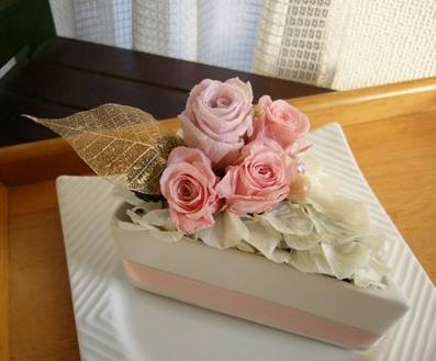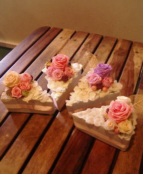 今日は「ティーズマリー・プリザーブドフラワー1DAYレッスンinカフェKope」でした今回はプリザ・スィーツ第一弾!「ショートケーキ」です♪お蔭様でたくさんの方にご応募頂き、日程を本日と28日(月)に分けさせていただきました!ご協力ありがといございました!!(大変申し訳ありませんが募集は締め切らせて頂いております。)今日は、初参加の方お一人と、リピーターさん3名様、計4名様でのレッスンです花びらを生クリームに見立てて「美味しそう」に作って頂きました♪ローズを選んだりアレンジしたり、最初はわいわいとレッスンしていましたが生クリーム作業に入ると、皆さんかなり真剣に没頭しておりました!!今回は記念撮影を忘れないよう、レッスン中に撮ってみました本日ご参加頂いた皆さんですそして、こちらが皆さんの作品です美味しそうキャイキャイと皆で作品の撮影をしていると、マスターがお皿を貸して下さいました♪OYさんの作品をお借りして私も撮らせて頂きました!可愛いレッスン中かなり静かな皆さんでしたが、ランチタイムにはおしゃべりに大盛り上がり!お菓子作り・習い事・焼肉・お米・アロマ・などなど色々な話題が飛び交っておりました左 :今週のKopeパン「海老とアボガドのサンド」 かなり美味しいです!!ハマリます!!中央:「ショコラ・オレオ」 チョコ好きにはたまらない一品!右 :「ブルーベリータルト」大粒のブルーベリーにかなり惹かれました!!注意☆ケーキ2つも食べてませんよ!ショコラとベルーベリーとかなり迷いましたが今回はショコラ 今日も楽しくレッスンさせて頂き、どうもありがとうごさいました!こちらは、お母様のバースデープレゼント用にご注文頂いたアレンジです。25日着で発送させていただきます!ご注文ありがとうございました。