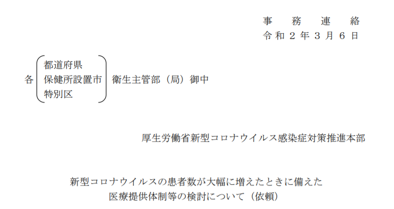 新型コロナウイルスの患者数が大幅に増えたときに備えた医療提供体制等の検討について(依頼)