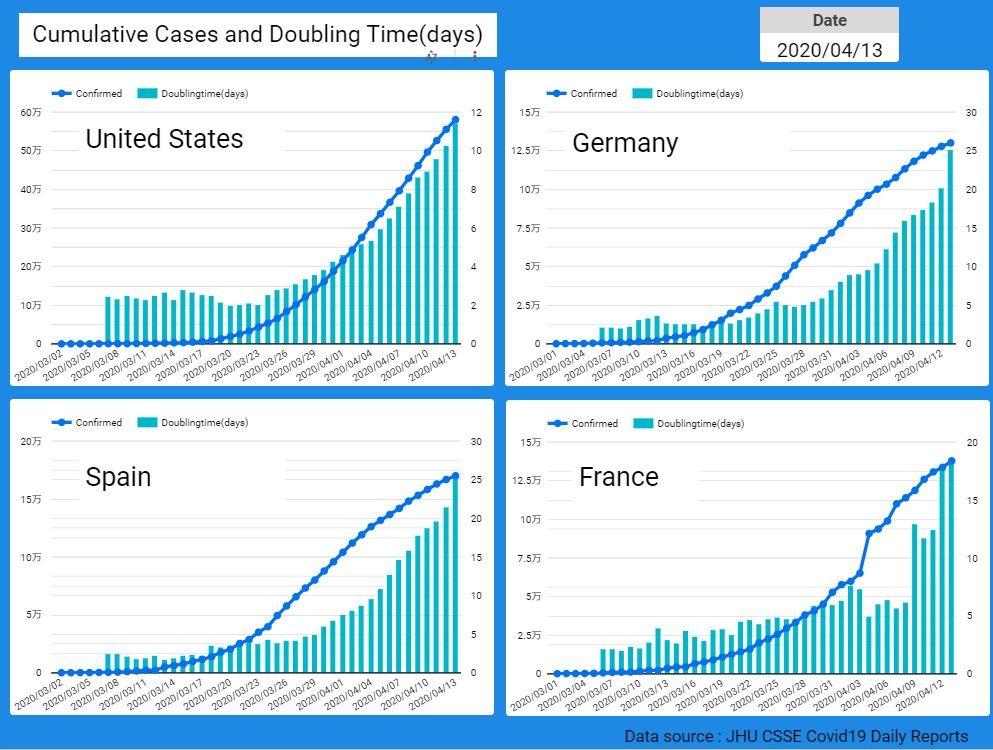 以前は、感染確認者数だけのグラフでしたが、倍加時間の要素を追加しました。