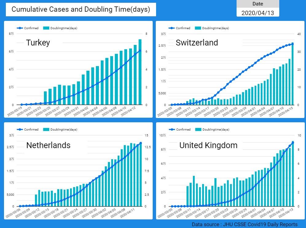 ​​​ 新型コロナウイルスの感染確認者数の倍加時間と感染確認者数の複合グラフのページをダッシュボードに追加しました。