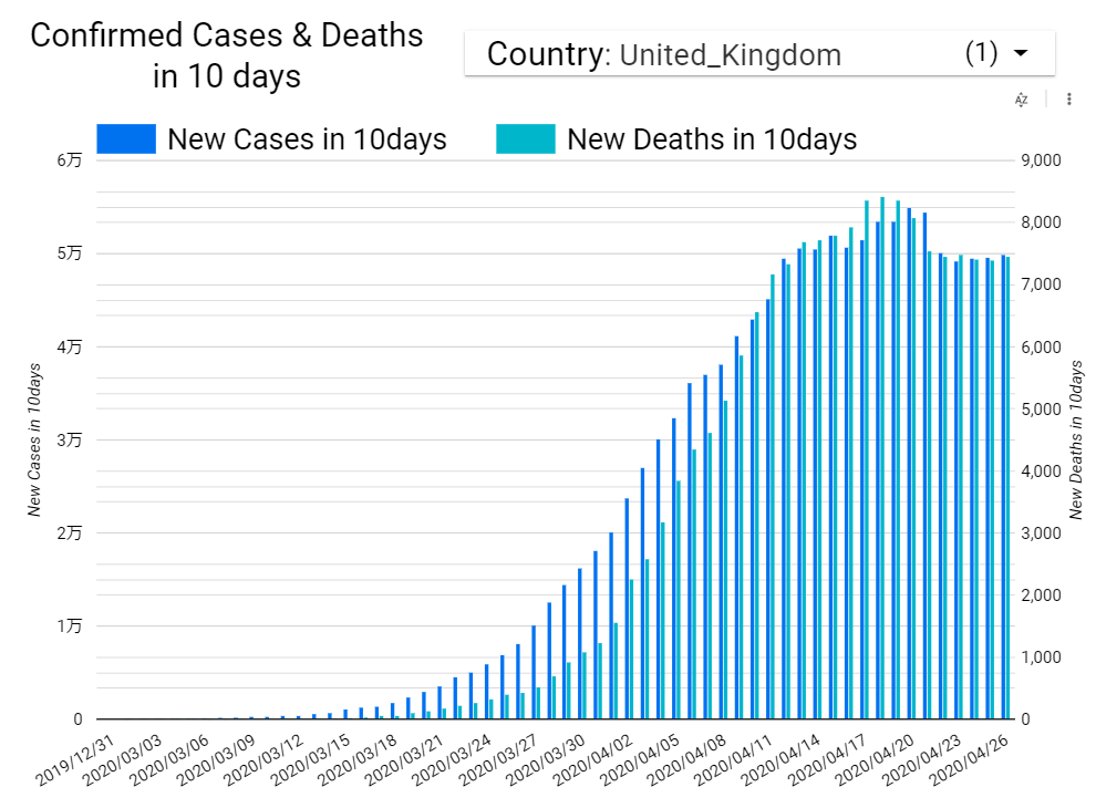 ↓イギリスの各日の「過去10日間での数」の推移です。新規の感染確認者数の減少が明確には見られないので、新規の死亡者数もしばらくは減少に転じないのではないでしょうか。感染確認者数の増加と死亡者数の増加の間にドイツの場合のような大きなタイムラグが見られませんが、「感染確認のタイミングが遅い」ということなのかもしれません。