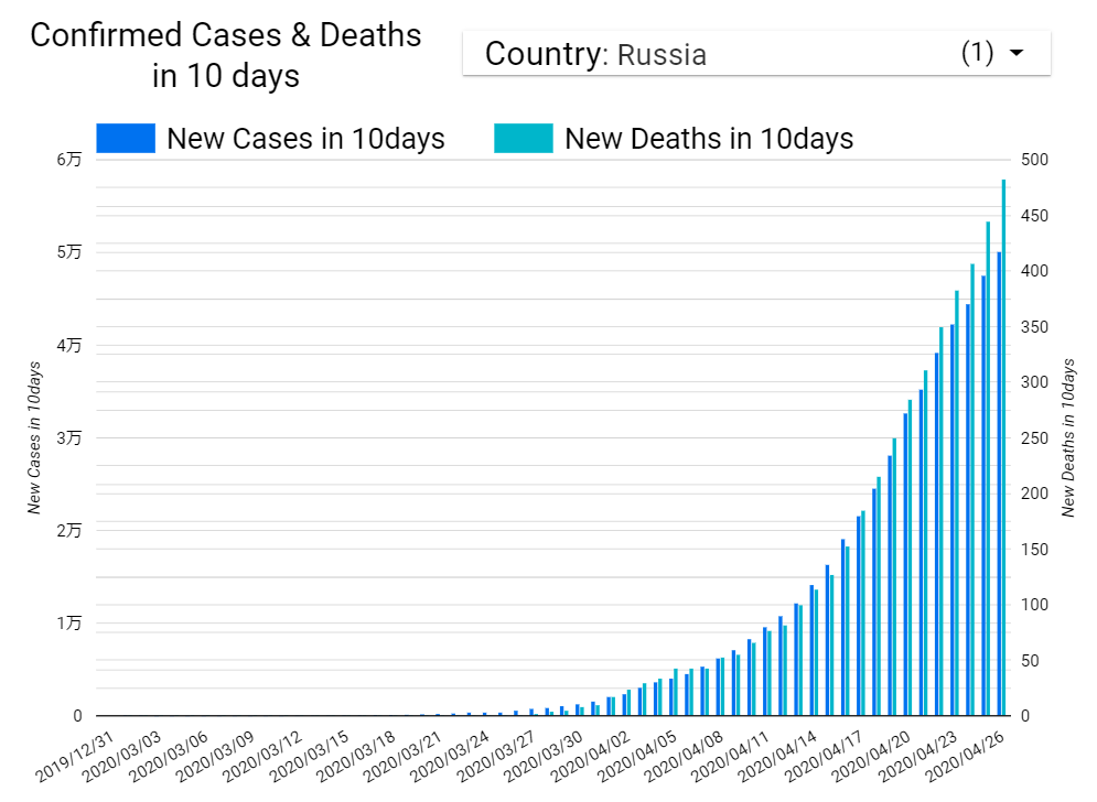 ↓ロシアの各日の「過去10日間での数」の推移です。新規の感染確認者数の増加につれて、新規の死亡者数も増加しています。ロシアは、急速な感染拡大局面にあることがわかります。タイムラグがほとんどなく、感染確認のペースが感染拡大ペースに追い付いていない可能性があるのかもしれません。