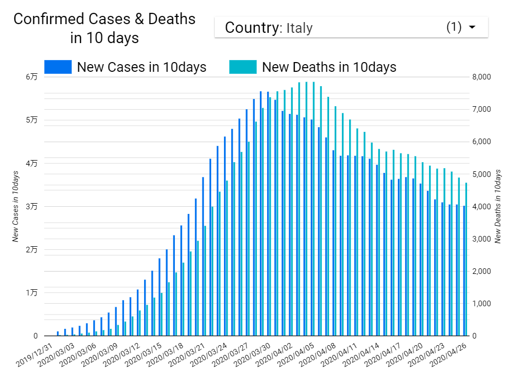 ↓イタリアの各日の「過去10日間での数」の推移です。新規の感染確認者数の減少につれて、新規の死亡者数も減少に転じています。