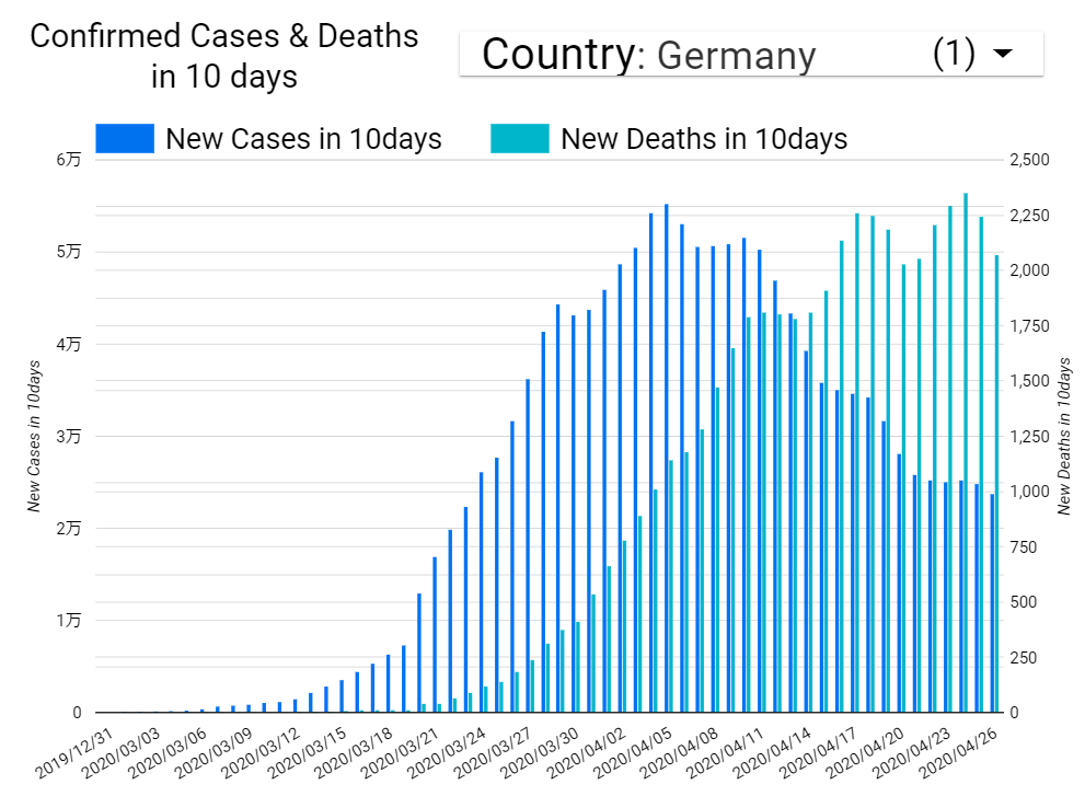 ↓ドイツの各日の「過去10日間での数」の推移です。新規の感染確認者数が減少しているので、今後、新規の死亡者数は減少していく可能性が高そうです。