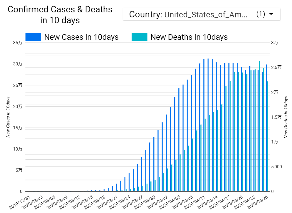 日々の新規の数字はブレが大きいので、「過去10日間の数」のグラフにしています。ECDCのデータを利用したダッシュボードでのグラフです。国ごとのグラフを簡単に作成できます。