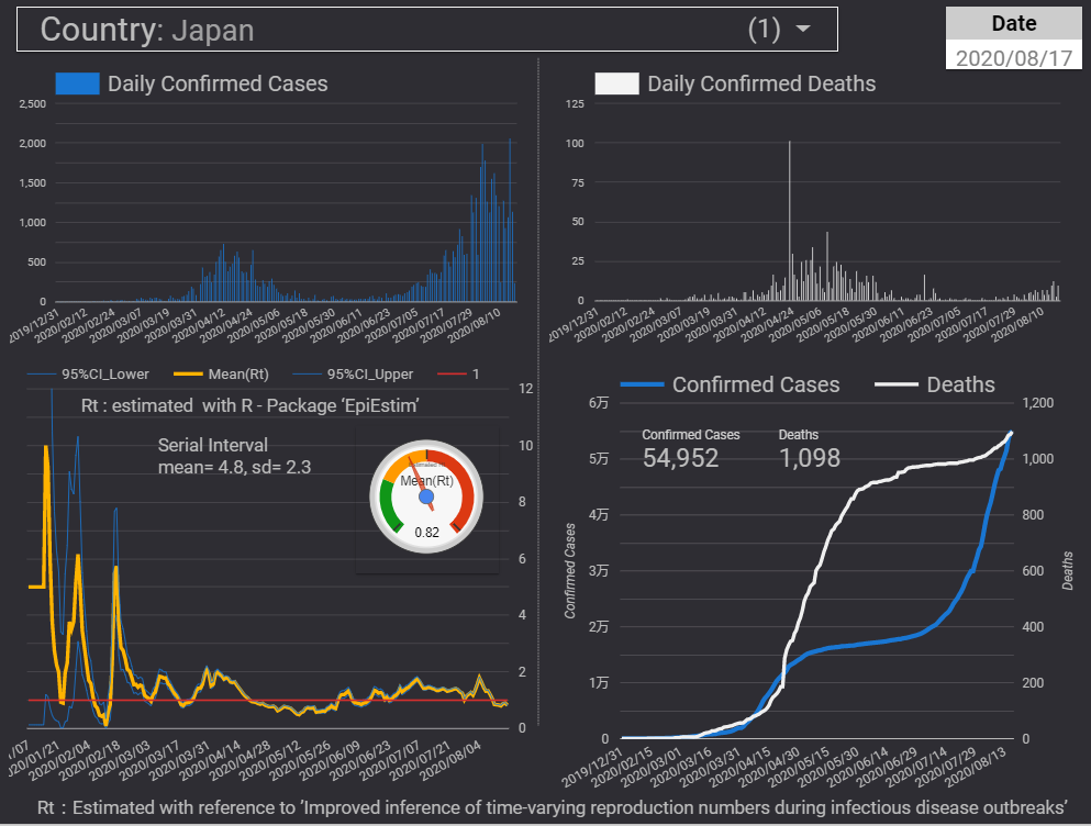 ↓ECDCのデータを利用したダッシュボードです。実効再生産数を表示するページを作成しています。