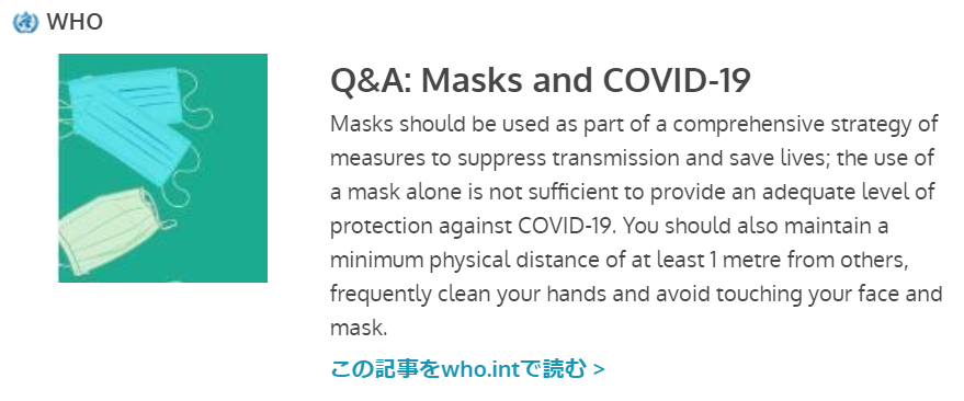WHOのマスクに対する見解は、 「Medical mask」の方が布マスクよりも感染予防効果が高い、ということを認めていると思います。