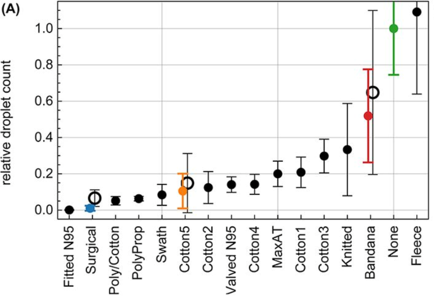 ​↓上記の論文中の図表です。素材による性能の違いは明らかです。フリース素材だと、マスクなしの場合よりも飛まつが飛ぶことがあるようです。素材によっては、逆効果のマスクもあるようです。