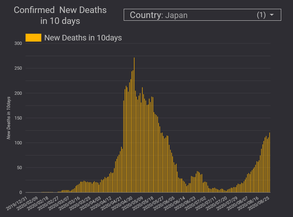 感染確認者数のピークを過ぎた可能性がある一方で、日本の死亡者数はまだピークに達していないようです。