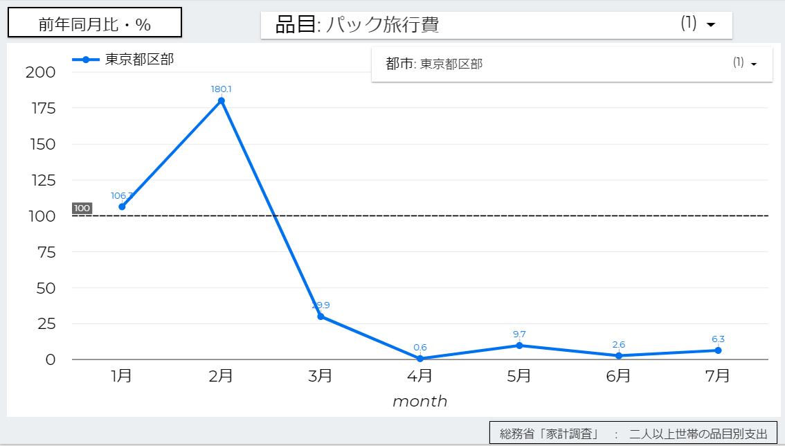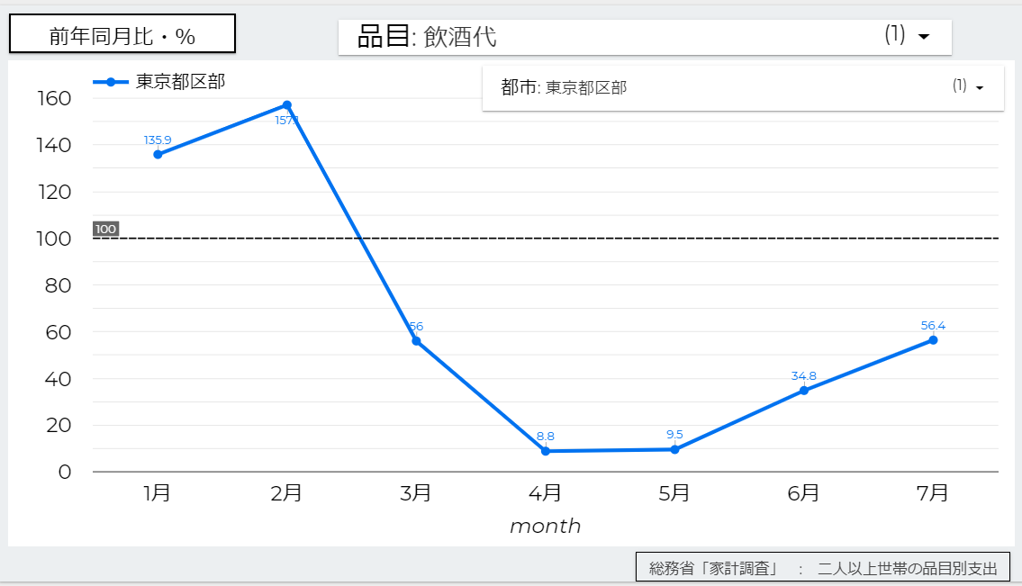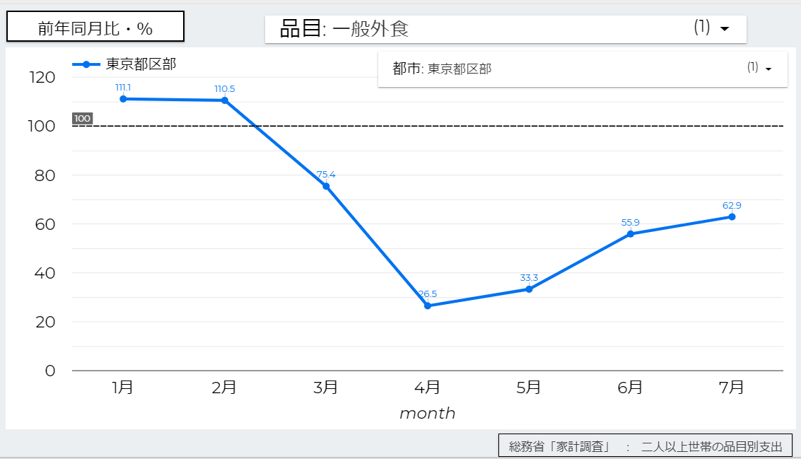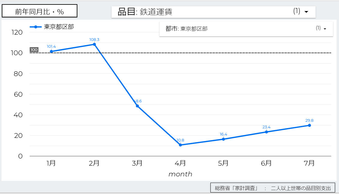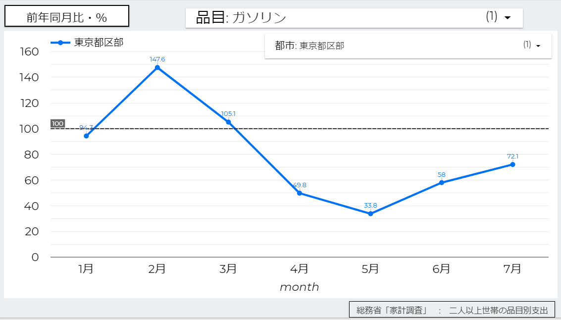 ダッシュボードでは、家計調査の一部の品目について、都市別に前年同月比の推移を見られるようにしています。