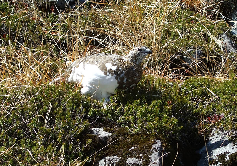 長々と紹介してきた槍・穂登山でしたが、私のレベルで対処できるのはギリギリこの時期までで、体力、装備両面で冬山には歯が立ちません。昨日、槍ヶ岳山荘のライブカメラ画像にアクセスしてみると、山荘前の広場は一面真っ白になっています。3000mの山は日毎に遠い世界になりつつあります。それはさておき、今年もあっちこっちの山で草臥れたオッサンを癒してくれたものの代表格がライチョウですが、場所や固体こそ違うものの、シーズンイン直後とオフシーズン直前では容姿も大きく変わり、成長の跡を見せてくれました。上は8月上旬、種池山荘前で大勢のギャラリーに取り巻かれて、ちょっと不安そうなヒナ達です。この時の雛は6羽いました。平均的な抱卵数は5~6個という説もあるので、この家族はこの時点で全員揃っていたのかも知れません。場所によっては、同時期でも2羽、3羽に減っていることが多く、鷲鷹類やオコジョなど天敵に晒されながらの極限の生活環境は気の毒になります。下は10月中旬に西鎌尾根で出会った固体で、2羽が大きく育って、既に体型で親子を識別することはできなくなっています。冬毛への衣替えも始まって、もう飛べる状態になっているのかも知れません。この先、厳しい冬を無事に越してくれるよう祈るばかりです。