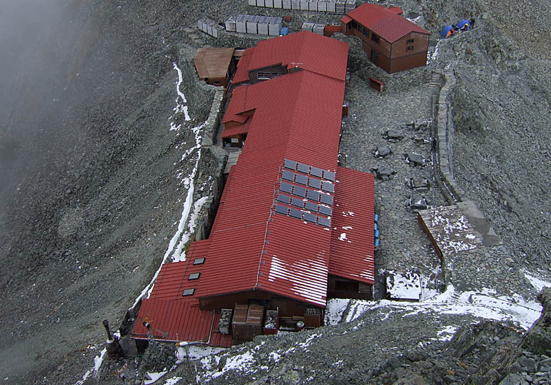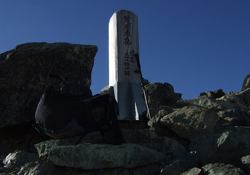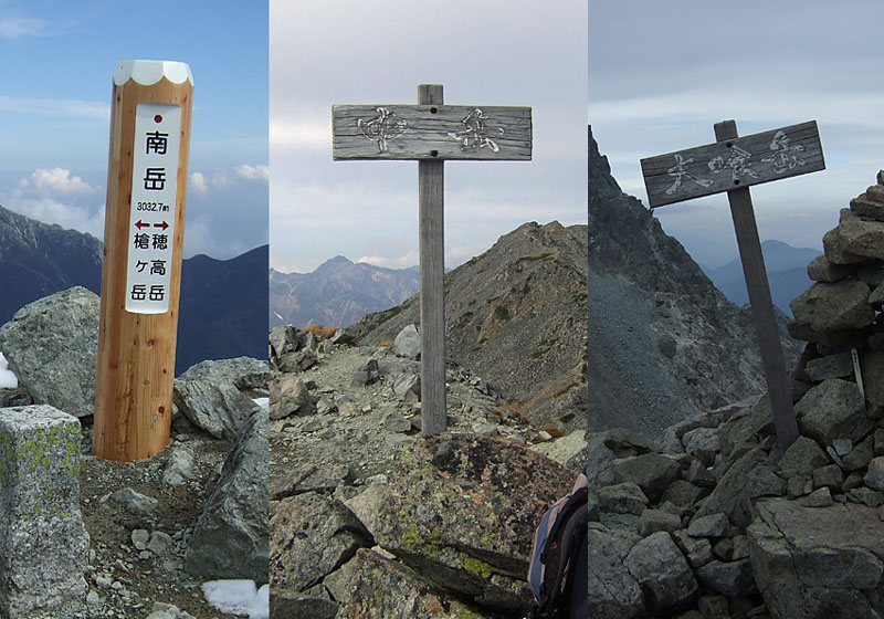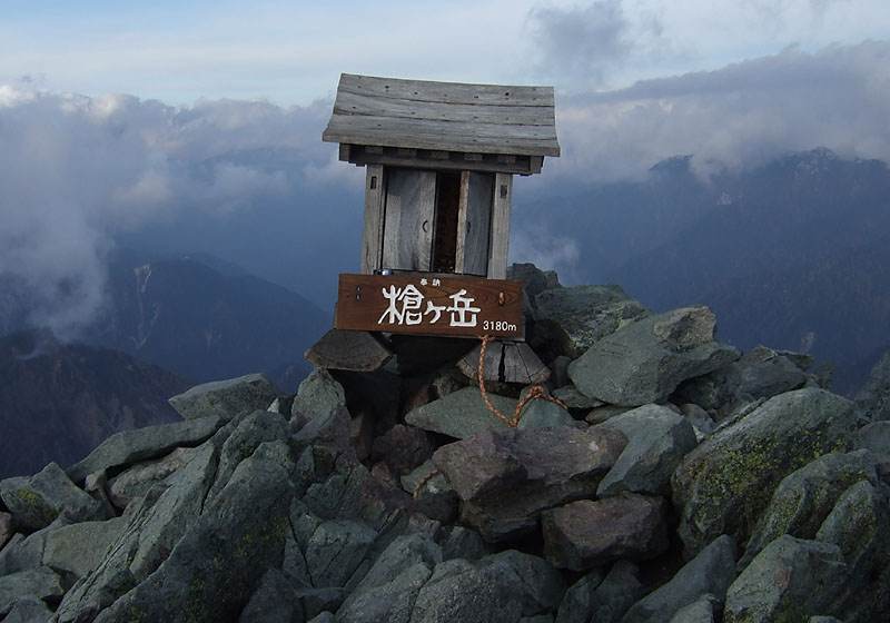 10/15~18にかけて、今年の歩き納めに穂高岳から槍ヶ岳にかけての山々を歩いて来ました。前日(14日)に降った雨が、2500m以上の高山帯では雪になった影響で、北側斜面には雪が残っていました。このため登山計画の変更を強いられたりと、想定外の出来事もありましたが、結果的には一帯の3000m級のピーク7つを踏んで、先程無事帰って来ました。詳細はボチボチと紹介して行きます。左は槍ヶ岳の山頂にまつられた祠ですが、強風で飛ばされない様、しっかりアンカー(実は岩石^^;)が打たれています。少し傾いているところはご愛嬌、ということでしょうか。