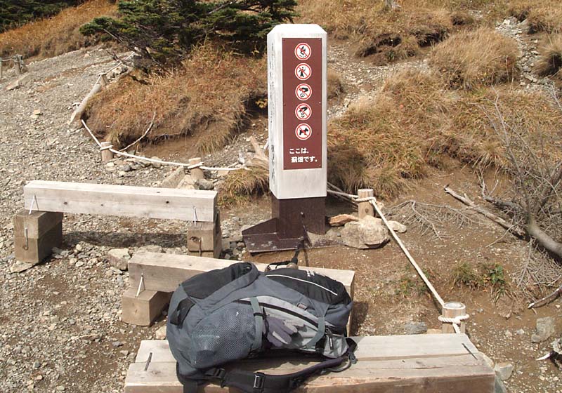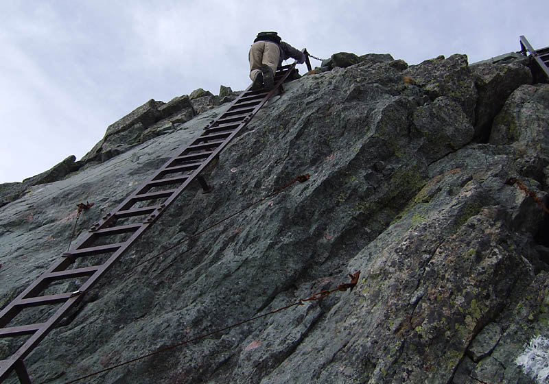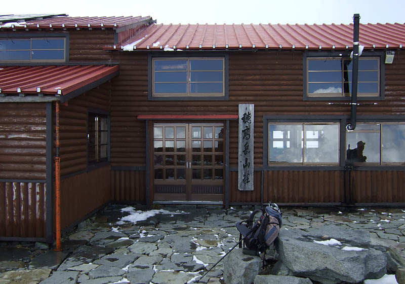 話は前後しますが、上の画像は槍の頂上への最後の梯子と、それを上り詰める登山者で、後姿ならOKという了解を貰って撮影したものです。この人とは、後に山荘で相部屋になり、いろいろ話を聞かせて戴きました。さてその日の夕食の際、人数を数えてみると日本人が老若男女合わせて12名、やや遅れて食堂に集まったデンマーク人のパーティ12名の、総勢24名がこの日の宿泊者でした。食事が終わった後、玄関脇のストーブの周りに、この宿泊者の大半が集まり、英語、ドイツ語、関西弁、九州弁、標準語、その他方言とり混ぜての、賑やかで訳が判るようで判らない宴会が2時間にわたって繰り広げられました。その翌日は、自分一人だけが西鎌尾根経由で、双六岳方面を目指して出発しましたが、途中で異様に脚の運びが悪化していることに気付かされ、急遽計画を放棄して千丈乗越から飛騨沢に下り、新穂高登山口に向けて下山しました。予定を大幅に組み替えたりしながら3日間歩き続けたことで、筋肉が伸びきったゴム紐状態になっていたようです。樅沢岳や双六岳は取りこぼす結果になりましたが、充実した”1万尺徘徊”ができた4日間でした。