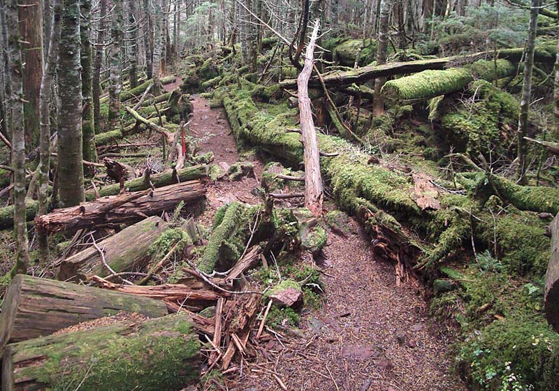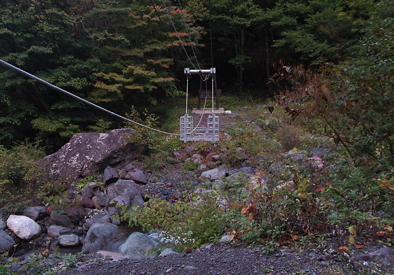 ”秋の夜長”は、裏返せば昼が短い(あったり前だろ!)ということで、今回は夜も明け切らない5:10に出発しました。当然周囲は真っ暗で、ヘッドライトのお世話になりながらの歩きです。登山口から2.5kmほどは林鉄跡の広い遊歩道を進みます。40分ほどかかって、遊歩道の終点、西沢渡に着いた頃には、すっかり明るくなっていました。ここで沢の対岸に渡るのですが、橋ではなくゴンドラが敷設されています。沢の中ほどに停まったゴンドラを、人力で引き寄せて乗り込み、こんどは人力で対岸を手繰り寄せる(・・・?)ことになります。垂れ下がったワイヤーロープにぶら下がったゴンドラは、沢の中間までは自然に進むのですが、ここから先が実に大変な力仕事です。200kg前後のゴンドラ+自分の体重を1m近く引き上げることになる訳で、単独行の登山者には過酷な作業です。この沢を渡り切ると、ひたすら急斜面を登り続けることになります。尾根に出るまで、標高差で1300mもの森林を歩くコースは、外の景色を楽しむことは絶望ですが、中ほどの鬱蒼とした原生林の底では、累々と倒木が横たわり、これらに根付いたコケが美しい景観を醸し出しています。今回は『急いで登り、急いで下る』必要があって、じっくり眺めることができませんでしたが、いつか、このコケだけを見に行きたいものです。