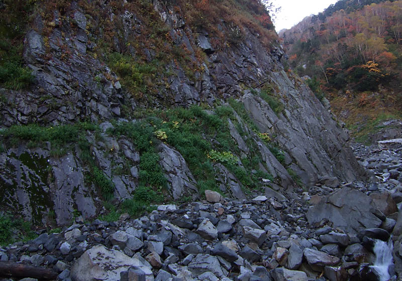 白出大滝が見えるところを過ぎて程なく、コースは沢に出ます。ここに架けられた重太郎橋を渡ると、すぐに岸壁に穿たれた”岩切道”(左上)と呼ばれる狭い通路に踏み入れます。この道は狭い上に、次第に高度を上げて行き、スリル感を高揚させます。岩切道を過ぎると、再び森林に入り、次第に勾配を増しながら、大滝を高巻きして迂回します。大滝の上に出た辺りで、コースは再び沢に戻りますが、その再合流点が荷継沢で、かって小屋があったらしい石垣造りの構造物が残っています。この先、沢に水は無く、累々と大小の岩石が積み重なった中を進むことになります。勾配はおよそ30度、半端なしんどさではありません。1.5kmほど続く岩石の沢は、中ほどで少し左に方向を変えますが、この屈曲点を過ぎると穂高岳山荘の石垣や屋根が見え始めます。目標物が見えているにも関わらず、これに一向に近付けないもどかしさを味わうことになりますが、本当の所は疲労困憊してしまい、歩いているより休んでいる時間が増えている、というのが正しいかも知れません。尾根に近付くにつれ、沢は次第に幅が狭くなり、両側の岸壁が近くなります。時々この岸壁から、乾いた音をこだまさせながら、岩石が落ちて来るのにはビビッてしまいました。