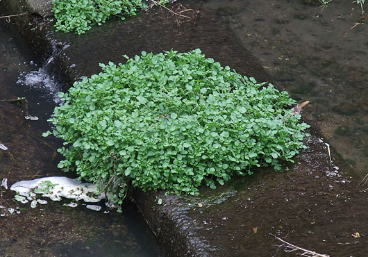 我が家の前を流れる小川(ドブガワ)の土手や川原の雑草が勢いを失う傍らで、招かれざる客、クレソンが勢力を拡大し始めました。昨年、群落がこんな大きさ(長径60cm)に育ったのは12月半ばだったので、1月半も早い始動です。この勢いで春まで成長が続いたら、来年の春には河川敷が完全にクレソンで埋め尽くされるかも知れません。恐るべし、クレソンの生命力。それにしても、これをアシストしているのが、我々人間の生活汚水だと思うと、考えさせられます。