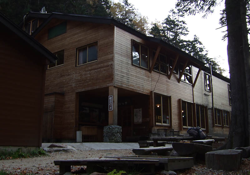 穂高岳への登山は、上高地から涸沢を経て登るのが一般的ですが、今回は超マイナーな新穂高温泉から、白出沢を通るコースを選びました。出発前の計画では、このコースでまず奥穂高岳に登り、その日は穂高岳山荘に泊まります。2日目は涸沢岳、北穂高岳に次いで、難関の大キレットを体験した後、南岳、中岳、大喰岳を経て槍ヶ岳山荘で2泊目。3日目は槍ヶ岳を往復した後、双六岳の向かい、以後の予定は天気と相談、という、何とも欲張りな計画でしたが、そんなに山は甘くはありません。新穂高温泉の登山指導センターに入山届けを投函して歩き始めたのは4:43、当然まだ真っ暗です。始めは広い林道を歩くことになります。林道区間は6kmほどで、途中少しだけショートカットする部分もありますが、闇夜の険しい山道では時間の短縮効果は微妙です。1時間ほど歩くと穂高平小屋に着きますが、この辺でようやく明るくなりました。更に40分ほど、紅葉の中をのどかに歩くと白出荷継小屋跡に到着、コースはここから険しい山道に入ります。この山道を1時間ほど進むと、木々の隙間から白出大滝が見える位置まで近付きますが、この後滝の本体を見ることはできません。左右の稜線の交点辺りの平らな部分が穂高岳山荘、右側の稜線は奥穂高岳本体の一部です。