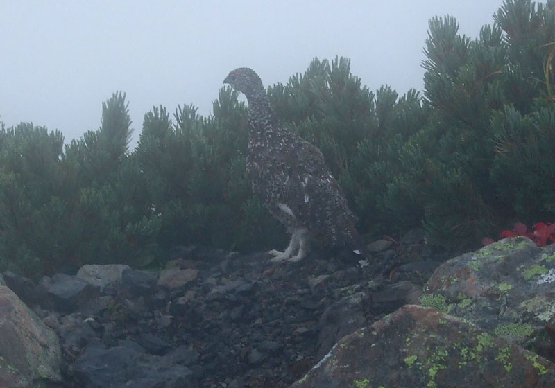 強風+湿っぽいガス+寒さ=早めに退散 ということにして、山頂滞在は僅か7分で下山にかかりました。大骨折って歩き詰めてきた割には、呆気ない幕引きですが、この天候ではさほど未練もありません。山頂部を後にする直前、この山でもライチョウの親子に会えました。やはり警戒心が強く、4羽いたヒナはクモの子を散らすように、ハイマツの茂みに逃げ込んでしまいました。1羽だけ残った母鳥が”鳴き声通信”でヒナ達の所在を確認している様子です。ここでも稜線を離れて南斜面に少し下っただけで、強風はピタッと治まりました。地形の威力は偉大です。ただ、ガスの方はこの後も長いお付き合いになりました。山頂部から富士見平までは、ガレ場、岩場取り混ぜて、アップダウンの入り組む難所が続きます。この部分さえ乗り切れば、後は比較的緩やかな尾根歩きが続きます。ここも深い森の底のコースなので、風景を楽しみながら歩きたい向きには、退屈極まりないコースかも知れません。この森の標高1500m付近で、時期外れのギンリョウソウの群落に出会えました。葉緑素を持たず、朽ちた落葉などに寄生するこの花の花期は6~7月の筈ですが、この時期に会えたのはラッキーかも知れません。
