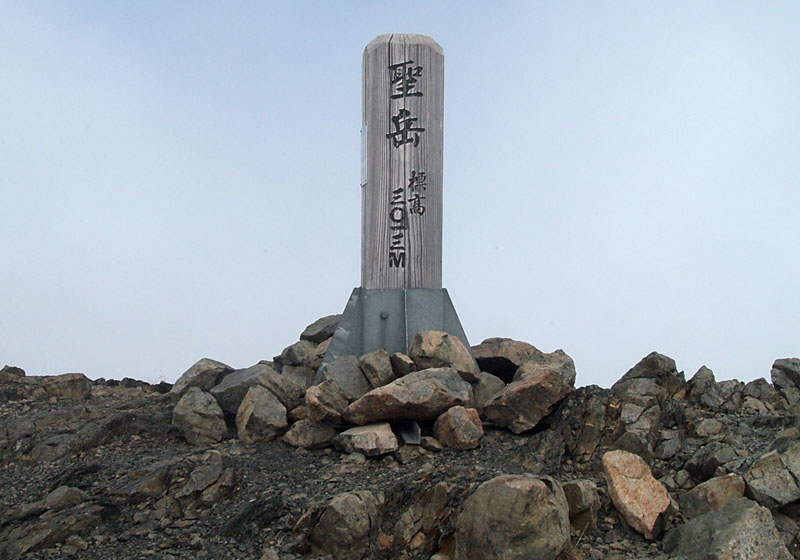 樹海のコースを歩き続けて3時間半と少し、何とか尾根に着きました。薊畑です。登山路はここで聖岳に向かうコースと、聖平小屋や小河内岳、光岳に向かうコースに分岐します。休憩用に角材のベンチが設置されていますが、地盤の変動のせいか、どれもこれも微妙に傾いています。周囲は紅葉の真っ盛りなのですが、残念ながらガスのせいで、風景も色合いもクリアさがありません。ここで15分ほど休憩と軽い食事でスタミナを補給。残り標高差600mほど。あと一踏ん張りです。薊畑というものの、草地に生えているのは”マルバタケブキ”ばかりで、アザミは殆ど目に付きません。この辺りから樹木は次第に樹高が低くなり、天気さえ良ければ風景を楽しみながら歩ける筈なのですが、今日はガスでさっぱりです。標高2660mの小聖岳に着く頃には、潅木も途切れ途切れとなり、山頂への最後の急登ではハイマツ以外は生えていません。11:40 聖岳山頂(3013m)に到着。山頂部はなだらかな台地状になっており、5~600m離れた奥聖岳(2982m)まで緩やかな下り勾配になっています。左下は奥聖から聖岳に戻る途中ですが、量は少ないながらここでもウラシマツツジが紅葉の盛期ですが、直射光がないだけに鮮やかさに欠けます。