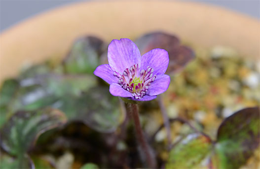 雪割草の今年の1番花が開花しました。といっても今の段階は花弁が開いた、というだけで、成熟した状態ではありません。今はまだオシベは変化が始まる前の段階で、一見して普通の標準花のように見えます。しかし個体は二段咲きのもので、開花が進むに従ってオシベが変形して、シャモジのような形の花弁のように変化します。気温が低いためか、こうした変化のペースは非常にゆっくり進行しているようで、先般取り上げたネリネほどではないにしても、花の寿命はいくらか長くなりそうです。 この品種の最初のツボミが姿を見せたのは12月の初めでした。その時は早過ぎるだの、年も改まらぬうちに咲いてしまっては興醒めだの、悪口雑言を並べ立てたものでした。それが聞こえた(!)のか、その後そのツボミはスコンと動きを止めてしまい、今も殆ど形を変えていません。2番手のツボミが先に開花することになってしまいましたが、1番手にもふて腐れから脱却して、早めに開花して貰いたいものです ^^。