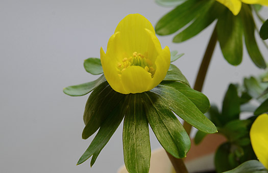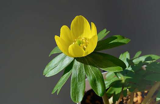 昨日掲載した画像は室内の蛍光灯照明下で撮影したため、色かぶりが出てしまいました。という訳で、今回の画像は改めて自然光の下で撮影し直したものです。グレーの背景は濃度の濃いものに変更しています。昨日の画像と同じ個体ですが、花弁(正確には萼弁だと・・・)の黄色、葉っぱの緑などの色合いやディティールがかなり鮮やかになりました。昨日の時点では、葉っぱは少々萎びていましたが、たっぷり給水して1晩室内のやや暖かいところで過ごしたら、シャキンとしていました。