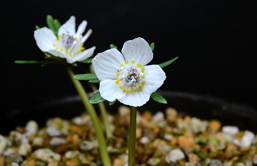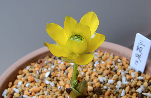 セツブンソウ(節分草)が開花しました。ツボミが用土から顔を出して2日目、予想を大きく外す素早い展開です。いやはや、あてにならない予想で面目ない次第です。 過去に我が家で開花したものや自生地で咲くものは花の直径は2cmほどですが、今年の花は1.5cmほどしかなく、かなり小振りな印象です。同様に草丈も半分ほどの5cmしかありませんが、こちらはこの先伸びる可能性があります。こうした外見上の出来の悪さの一方で、花弁が退化した(注:白い花弁様のものは萼弁)黄色い蜜腺の配列はほぼ正円で、この点は分球前の親の特性をキッチリ受け継いでいます。来年は標準サイズの花が咲かせられるよう肥培に努めることにします。