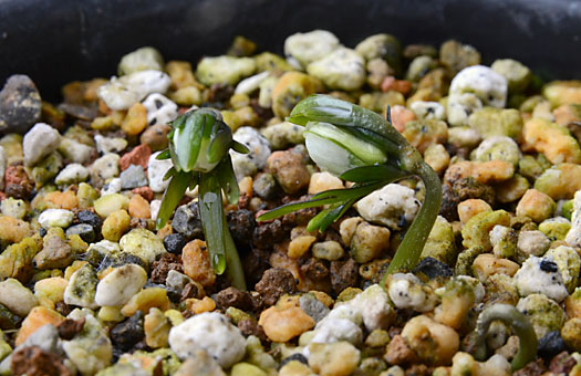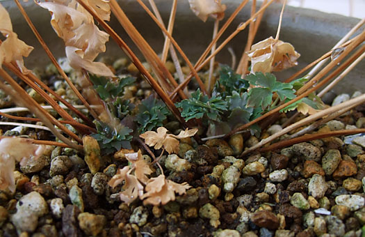 セツブンソウ(節分草)の花は一巡して、今は残骸が残るだけです。開花直後には草丈は5cmほどだったものが、日差しが弱い屋内に置いていることもあって、この1週間で10cmまで伸びました。今年の開花株は結果的に3芽でしたが、その足元には6芽の未開花株がたむろしています。この子達は昨年と比べても殆ど成長の跡が見られません。この臥体では、今年の夏を無事に乗り切ったとしても、来年春に開花能力を備えるところまで成長できるかどうか、心もとない限りです。 といいながら、夏越しのキーになるのは、効果的な潅水次第といえます。現行の自動潅水は風による散水範囲の変動が避けられないという欠点を抱えており、この弱点を克服しなければなりません。現在2-3案の改善策について実現性や経済性を考慮中ですが、暖かくなるころにはしっかりした対策を織り込んで、休眠中の”事故死”の防止を図るつもりです。