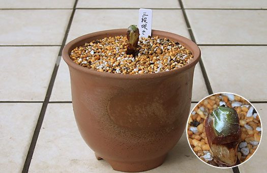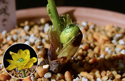 昨日取り上げた3点の花苗のうち、福寿草・三段咲は開花に向けて大きく踏み出していました。ツボミ(円内)は既にグリンピース大まで膨らんでおり、温度条件さえ整えばあと数日で開花しそうな雰囲気です。この塩ビポットのまま開花させるのも一つの選択肢ですが、いかにも見栄えが悪過ぎます。かといって、ここまで育ったものを、今根を露出させて植え替えると、花に過度のダメージを与えかねません。 という訳で最終的に選択した方法は、中間を取って塩ビポットのまま5号陶鉢に収容し、全体を山野草用土を充填してそれと分らないようにするものです。これならツボミや根に対するダメージは皆無で、開花プロセスの進行に対する障害は回避できる筈です。ということで仕上がった様子が上画像です。これでいつ開花してもOK・・という状態に漕ぎ着けたことになります。 花後3ヶ月ほどで長い休眠に入りますが、その時点で改めて最終的な植え替えを行うことにします。