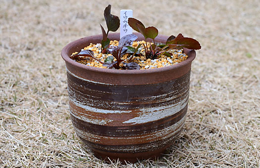 ものはついで・・・ということで、花期まで十分時間があるイワウチワ(岩団扇)を植え替えることにしました。ポットから取り出すと3株で1セットになっていました。うち1株には花芽らしいものが付いており、うまくすればこの春花を見られるかもしれません。根の具合はこれまでに手に入れたものよりしっかりしており、定着には幾分かは有利かも・・などと期待したくなります。とはいうものの、この品種の特性とでもいうのか、割り箸にトウモロコシのヒゲをくっ付けたような姿は、”多年草”とは信じがたい”造り”です。 自生地に近い土壌にする意味で、高山系の草花ではあまり使わない腐葉土を裁断して、赤玉土と鹿沼土の混合用土に20%ほど混ぜました。水捌けは幾分劣化するかもしれませんが、定着と生育環境を優先した選択です。というような経過で仕上げた状態が上の画像です。新居は取って置きの信楽焼の5号陶鉢、この花に対する期待の現われです。