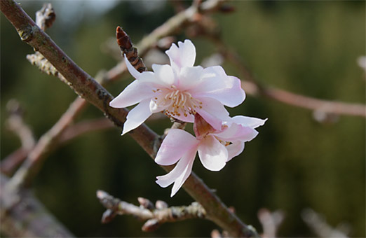 大寒のこの時期にこそ優雅に「花見」を・・という訳ではありませんが、淡路島に出掛けたついでに、馴染みの寒中に咲くサクラに立ち寄ってみました。品種については確かな話とは言えませんが、咲き方や花弁の特徴から「十月桜」ではないかと思います。例年この時期には50輪ぐらいは咲いているところが、今年の冷え込みは相当応えているのでしょうか、僅かに7輪しか咲いていません。花びらを落とした残骸は20個ほど認められたので、細々とですが咲き続けているようです。ちょっぴり寂しい開花風景でしたが、それでも少しだけ春を先取りしたような、明るい気分で戻って来ました。
