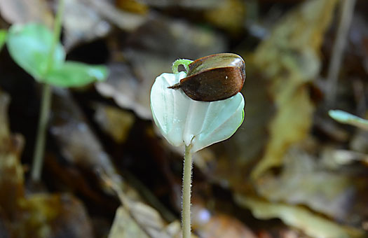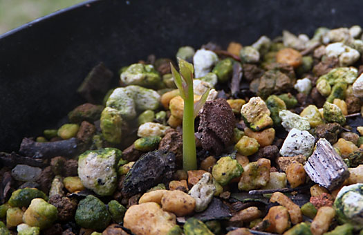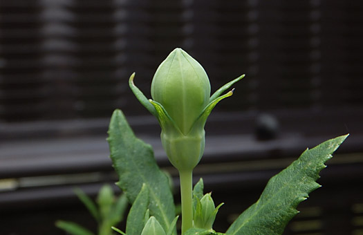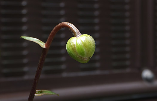 アポイギキョウのツボミがそれらしい形になって来ました。といっても今の大きさは、画像の個体でヘタの部分を含めてピーナッツ大で、開花までには一回り大きくなる必要があります。去年の記録をめくってみると、この時期早いものは開花寸前だったので、今年の進行状況は幾分遅れ気味ということになります。 話は急に反れてしまいますが、5/1に「イブキトラノオ(?)発芽」と紹介したものは、二枚葉が出揃ったところで葉っぱの形などの特徴が、次第にアポイギキョウのそれに近付いて来ました。期待のイブキトラノオは”まぼろし”に終ってしまいました。他の品種のポットやプランタでも大量に発芽しており、保護者の気付かぬところでかなり精力的に種子を撒き散らしていたようです。これが全部育ってしまうと、我が家の園芸環境はパニックに陥りそうで、単純な白花の特徴を発現したものから間引きして行くつもりです。