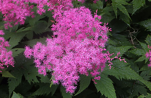 シモツケソウ(下野草)が最盛期を迎えました。「まだ咲いてないツボミがたくさんあるじゃん!」・・という突っ込みを戴きそうですが、初期に開花したものは既に散り始めており、花のボリュームがこれ以上膨らむことはありません。一つひとつの花は、直径3~4mmしかなく、衰え始めたワタシの眼では、肉眼で花の様子を観察することも困難です。画像はその小さな花が集合した塊で、ソフトボールぐらいの大きさです。小さめのワタ飴を連想して戴ければいいかと思います。こんなフワフワした塊が30余り集まって、ちょっとした花園が出来上がりました。雨さえ降らなければ、あと2-3日は楽しめるのではないかと思います。