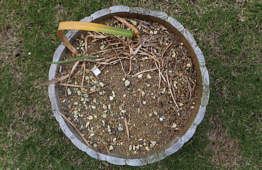 リコリスが葉っぱを脱ぎ捨てて束の間の休眠に入りました。画像のプランタには白花、赤花などの他に、まだ一度も花を付けていないものが10個前後埋まっている筈です。花の時期まであと2ヶ月、植え替えの適期がやって来ました。山行のシーズンが始まる前の一仕事・・・ということになりそうです。 昨年は我が家のリコリス一族は大凶作でした。合わせて20株近い保有球根のうち、花を付けたのは僅かに2株だけという惨憺たる有様でした。花後葉っぱが出始めてみると、4倍増、5倍増という風に分球しているのが確認できました。この時分球した個体が1年で開花株に成長するとは思いませんが、1-2年後には期待が持てそうです。とは言うものの、用土の下は相当な混雑ぶりを呈しているに違いありません。植付けて3年経つこともあり、今年は全面的な用土更新も兼ねて、一回り大きなプランタに植え替えるつもりです。