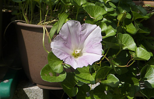 ハマヒルガオ(浜昼顔)の初花が開花しました。この他に2-3日遅れで開花しそうなツボミが多数控えているので、暫くは入れ替わり立ち代わりで咲き続けることになりそうです。15cmほどの蔓の欠片1本から始まった栽培ですが、現在は6号(18cm径)プラ鉢一杯に隙間もないほどの繁茂振りです。 ”ハマ”の名を冠してはいるものの、生命力はかなり強靭で、深く内陸に入り込んだところでも繁茂しています。我が家のの近く(海まで5km)では高速道路のコンクリート壁に開けられた水抜き穴から大株が垂れ下がっているのが見られます。他にも探せば平地でも自生していると思うのですが、そこまではしていません。
