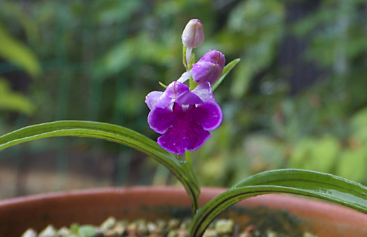ウチョウラン(羽蝶蘭)の最終ランナーが開花しました。これで保有品4点が全て開花したことになります。3番手、4番手の2点は一時危篤状態に陥ったことがあり、いずれも複数株あったものが、1株だけがかろうじて生き残りました。昨年は花を付ける元気もなかったのですが、今年は少数ながら花を見られるところまで体力を回復しました。次なる目標は、分球して2株、3株と増えて貰いたいところですが、その前に猛暑の夏越し・・という大きな壁が立ちはだかっています。