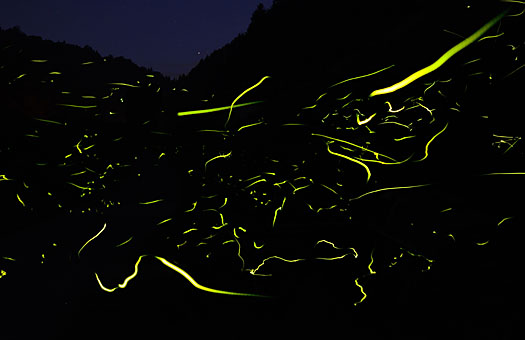 養父市奥米地の「ほたるの里」にホタル見物に行って来ました。見物とは言いながら、三脚込みで10kgを超える機材を担いでのホタル撮影が目的で、結構な労働になってしまいました ^^。出掛けたのは一昨日のことでしたが、帰宅が深夜になったことやRAWファイルの現像と画像編集に手間がかかり、この場で紹介するのが1日遅れになってしまいました。 駐車場で交通整理をしていたお年寄り(ワタシも・・ですけど ^^)に話を聞くと、今年は昨年の台風の影響もあってかホタルの数も少ないし、出現も遅れているとのことでした。外れ・・・も覚悟して、人家の少ない方に移動して日没を待ちました。8時頃になって少しずつ飛び始めましたが、数は予想していたよりも多目でした。とはいうものの、画像のように高密度で飛び交っている訳ではありません。掲載した画像は数枚の画像をコンポジット処理で重ねています。 (画像をクリックすれば、約2倍の拡大版を表示します)