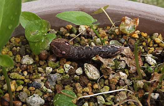 気温がグングン上昇するようになって、今年も画像のような曲者が出没し始めました。これはカラズビシャク(烏柄杓)のポットに寄生した、毛虫ともイモ虫とも判定が付き難いものです。6号ポットに密生していた家主を食い散らかして、殆ど丸坊主にしてしまいました。 正体は何か気になって、いつものWeb図鑑をめくってみると、スズメ蛾の仲間で、シタベニセスジスズメの幼虫であることが判りました。図鑑に掲載された画像では、上の画像のような黒褐色のものと緑色のものがありますが、これが成長に伴う変化なのか、それとも他の要因なのか・・という点については判らないままです。大きな目玉のような模様と、尾部のツノのような突起が特徴です。画像の個体は、新鮮なカラスビシャクの葉をたらふく食って、大人の小指ほどに太っていましたが、いつものキ○チョール一吹きで機能停止しました。