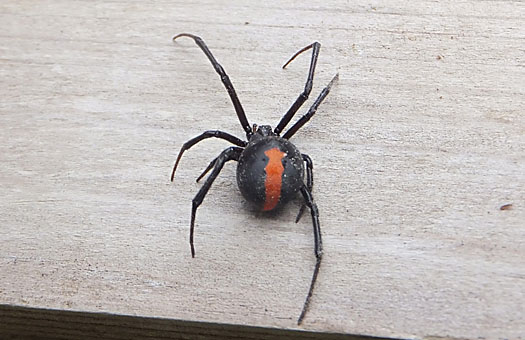 とうとう我が家にも嫌なヤツがやって来ました。セアカゴケグモです。数日前のことですが、地面スレスレに張られた出来損ないのようなクモの巣に、5cmを超えようかという大きな毛虫が引っ掛かって悶えていました。その毛虫を何とか仕留めようと、小さな黒いクモが何度かアタックするのですが、クネクネと暴れ回る毛虫に手を焼いている様子でした。この時はまさかこれがセアカゴケグモだとは思いもしませんでしたが、昨日になってこの巣を確認してみると、今度は背中をこちらに向けていました。その背中には、鮮やかな赤でクッキリと背番号「1」が描かれているではありませんか。いつかWebで見た、あの毒グモに酷似しています。大急ぎでWebで画像を再確認すると、間違いありません。 画像の個体で腹部の球体のサイズは大豆ぐらいです。他にいないかと周辺を探してみると、もう1匹見つかりました。2匹目は更に大型で、腹部はグリーンピースほどあります。試しに手持ちの殺虫剤、キ●チョールを一吹き吹き掛けてみると、コロリと昇天してしまいました。敵の存在に気付きさえすれば、駆除は簡単にできそうです。尚、このクモに噛まれたとしても、成人なら死ぬようなことはないそうですが、この先園芸作業もスリルとサスペンスに満ちた仕事になりそうです。