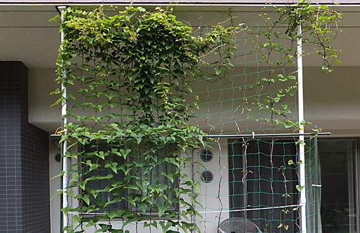 巷では節電策の一環として、グリーンカーテンの導入が流行っているようです。対象の植物としてゴーヤがどうの、アサガオがこうのと論議は尽きないようですが、我が家では山芋を選んで環境を整えて来ました。これを選んだ理由は、地上と地下で副産物が得られる・・・という、物欲先行の至って不純なものです。 植え付けを行ったのは春分の日でしたが、3ヶ月が経過してどうにか形ができ始めたので、現在の様子をご紹介します。幅1.8mの園芸ネットの左半分には短形自然薯、右半分には丹波芋とも呼ばれる球形に近い品種を植えています。丹波芋は芽出しが1ヶ月以上遅れたこともあって、カーテンはまだスケスケですが、これだけでも我が書斎(^^;単にPCを置いているというだけの話ですが・・・)への西日の差し込みはかなり軽減できています。一番喜んでいるのは、このネット裏に身を潜めて直射日光を避けている高山系の山野草たちのようで、強烈な日差しが適度な木漏れ日に変わり、例年より生き生きとしているように見えるのですが、これは単なる贔屓目かも・・・