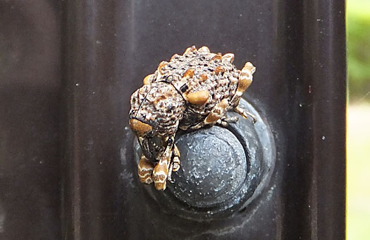 草花に水遣りをしていて、フェンスに奇妙なムシがいるのを発見しました。背中にはゴジラかイグアナのように、角のようなイボイボがたくさんあります。このツノなら攻めにも守りにも機能しそうです。見るからに強そうな風貌ですが、惜しむらくは体長が1.3cmほどしかないので、カブトムシやクワガタなど大型の敵には対抗できそうにはありません。 一体何という名前の虫なのか気になりだして、いつものようにWeb図鑑で調べてみました。程なく”マダラアシゾウムシ”(斑脚象虫)であることが分りました。主にクヌギやナラなどの新芽や樹液を食べるそうで、これなら我が家に長期滞在されても害はなさそうです。上の画像は子犬がお座りしたように行儀よくまとまった状態ですが、コチラのように活動状態の方が全体像が掴みやすいかもしれません。