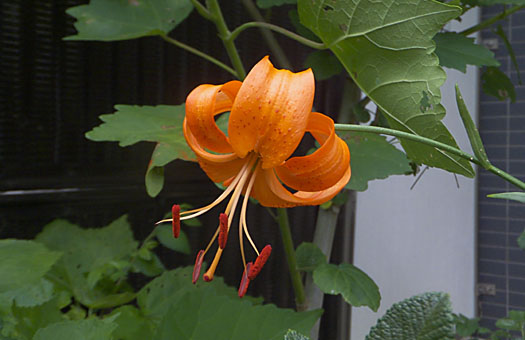 原種ユリ、リリウム・ダヴィディが開花しました。今年の株立ちは昨年と比べるとかなり小ぶりで、ツボミは開花したものを含めても僅かに6輪です。20輪を越えるものが3株立ち上がっていた昨年を思うと、甚だしいダイエットぶりです。ということはジリ貧かというと、そんなことでもなさそうで、足元には夥しい1枚葉の子株たちが屯しています。この子達が一人前に育って花を付けるようになるまでには2-3年は掛かりそうですが、その頃には再び『増え過ぎ』をぼやくことになるのかもしれません。 ユリの仲間では、この他に品種名不肖のものがツボミを膨らませていますが、こちらはムカゴで爆発的に増殖しつつあります。他の草花を購入した際、ポットに寄生していたものですが、興味半分でこれまで育てていました。その増殖ぶりは脅威を感じさせるところがあり、間もなく開花する初花の容姿次第では、規制対象になりそうです。