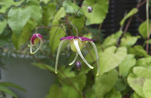 イカリソウ(碇草)の「楊貴妃」が今年3度目の頑張りを見せました。最初の炎上(?)は4月下旬で、この時が1番花の開花で、量的にも最も多くの花が約半月にわたって楽しめました。その後半月は花は途絶えましたが、5月の下旬になって2度目の花期が訪れました。昨年はこんなことはなかったのですが、3本の花茎が立ち上がり数日間の”宴”が続きました。 そして今回が3度目、流石に確認できる花茎は1本だけです。涼しい時期の花は2日から3日はもったのですが、気温が上がった昨今は、朝開花を確認したものが午後にはヘロヘロに草臥れてしまう・・という短命ぶりです。花にはそれぞれ最適な開花時期というのがあるようで、今咲いているものが何か良くないことの前兆でなければいいのですが・・・