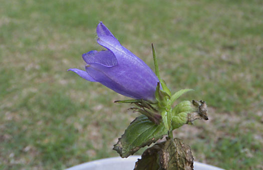 青花ホタルブクロが開花しました。とは言ってもとても喜べる状況にはありません。葉っぱ一つ取り上げても大半が赤茶けてしまい、殆ど枯死寸前の有様です。草丈は昨年は40cmはあったのが、今年は20cmに届いていません。花の長さも去年は6cmほどあったものが今年は4cmに届かず、本来なら垂れ下がる筈の花が上を向いたままであるなど、甚だしい萎縮振りです。この個体の諸々の様子が、瀕死の状況にあるらしいことを物語っているようです。時期は適切とは言い難いのですが、花後一度株を掘り返して、根や土壌の様子を点検してみようと思います。回復の見込みがあるなら、何とか元の元気な姿を取り戻せるよう、リハビリに専念させてみようと思います。