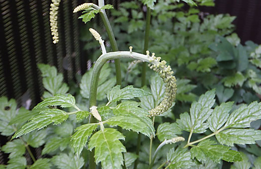 最近のサラシナショウマ(更級升麻)の花芽の様子です。「すくすくと素直に成長・・・」という風に書き込みたいところですが、現実はそんなに甘くありません。例年のことですが、我が家に生息する個体は、幼少期にかなり非行に走る傾向があり、今年も画像のようにキッチリ根性が捻じ曲がった状態で成長しつつあります。山地(標高2500m付近)に自生するものはスラリと素直に伸び上がり、ツボミの成長と共に頭(穂先)を垂れる・・・という風に、羨ましいような成長を遂げています。 画像の捻くれ者も開花の時期が近付くと、幾分は心を入れ替えるのか真っ直ぐに戻ろうとするのですが、若い頃の不摂生は尾を引き、本来の自然な円弧には戻り切れません。何とも悩ましい現実です。