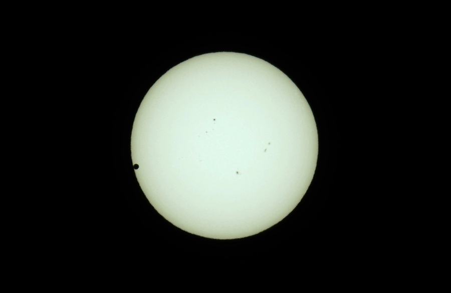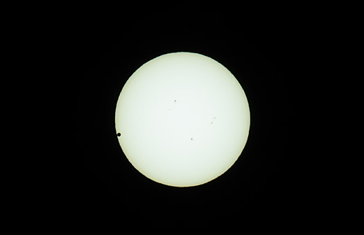 2日前の部分月食は、厚い雲に隠されて観察できませんでしたが、今世紀最後とされる金星の太陽面通過はこれ以上ないクリアな条件下で観察できました。画像は金星の全体が太陽面に入り込んだ時点(7:29頃)です。先日の金環食の際には、撮影に当ってデジカメの設定でチョンボがあって、肝心なところで不出来な画像になってしまいましたが、今回は一つひとつ確実な対策を行ったので、ほぼ保有機材の限界に近い画像が得られた(に違いない *^^*)と思います。 因みに使用機材は、Nikon D7000+Zoom-Nikkor 80-400mm に減光フィルターND400+ND16重ね使い(Total 1/6400に減光)しています。